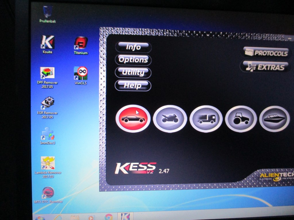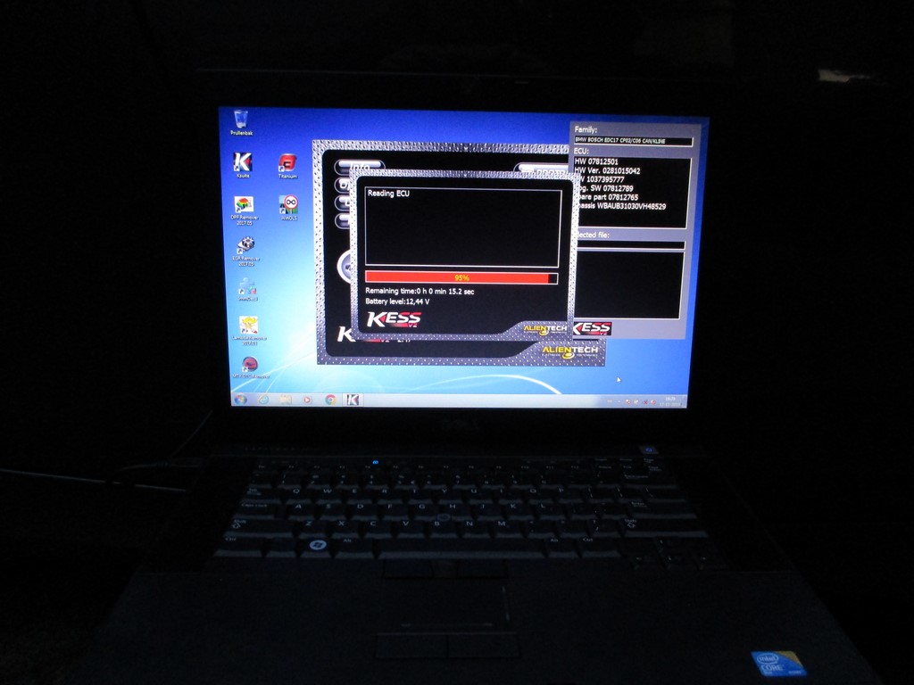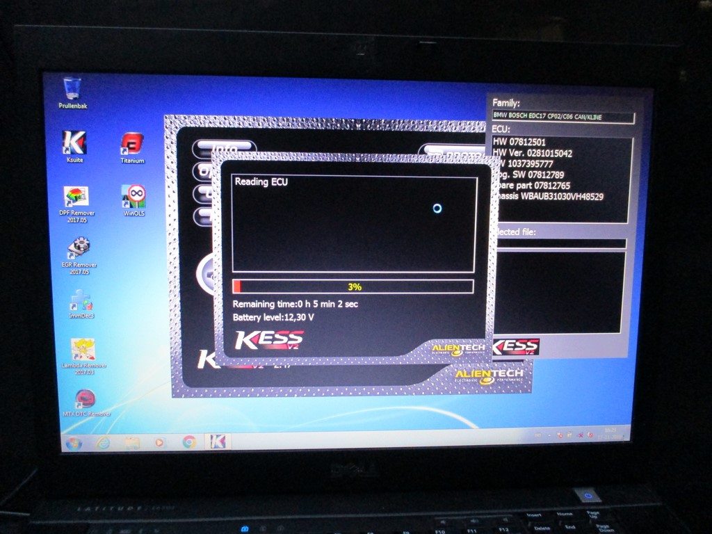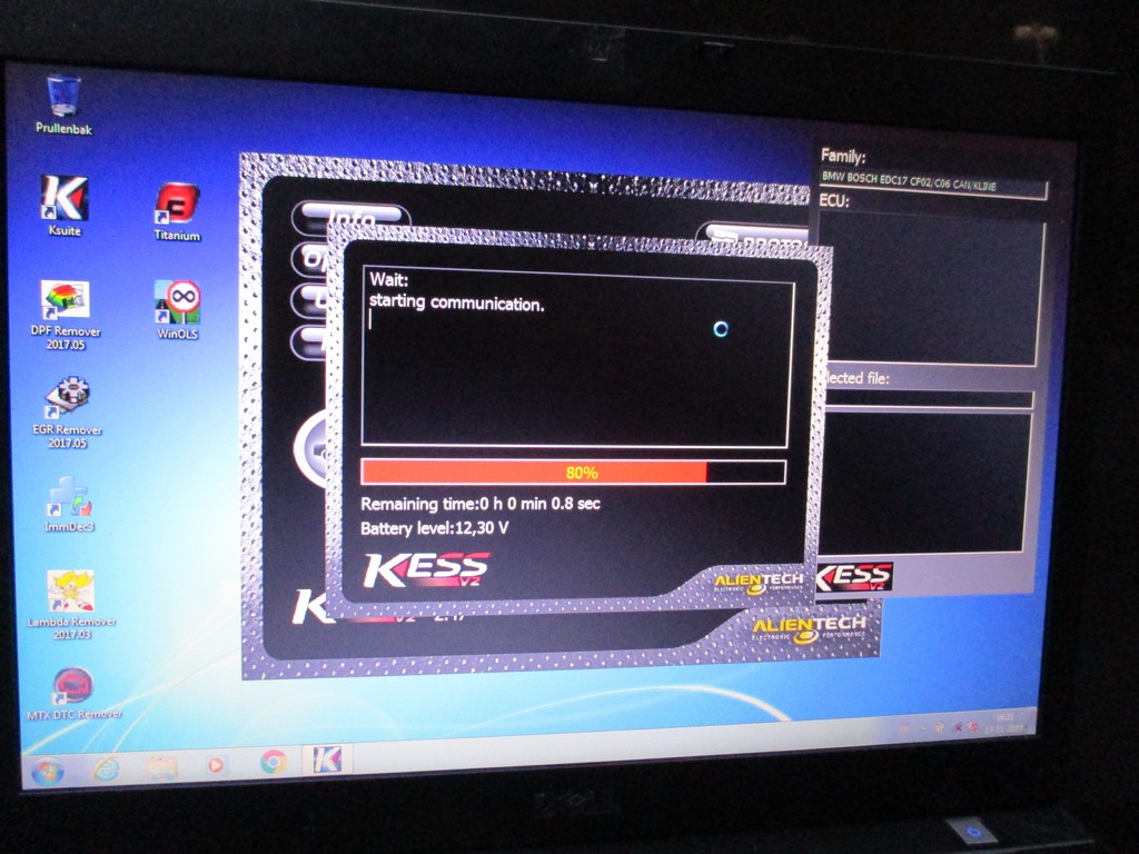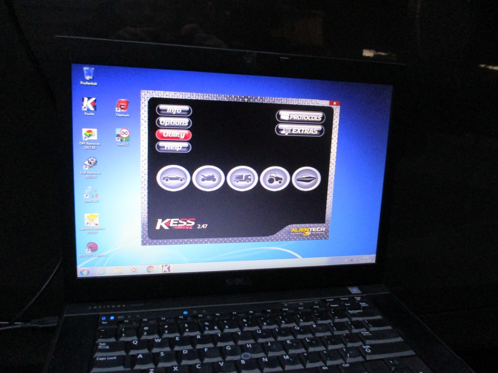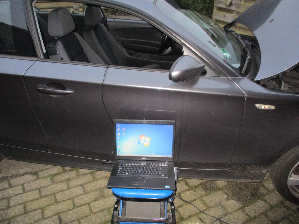 De KESS aansluiten op de OBD poort (motorkap staat open voor de acculader).
